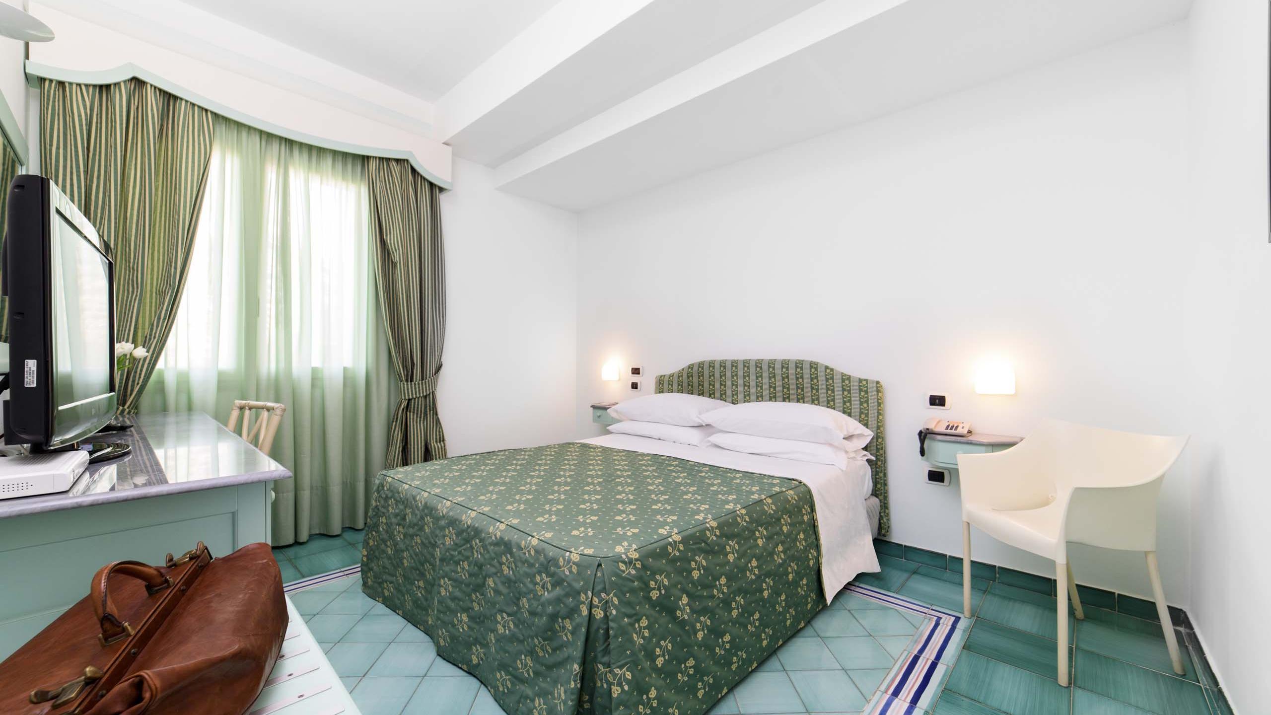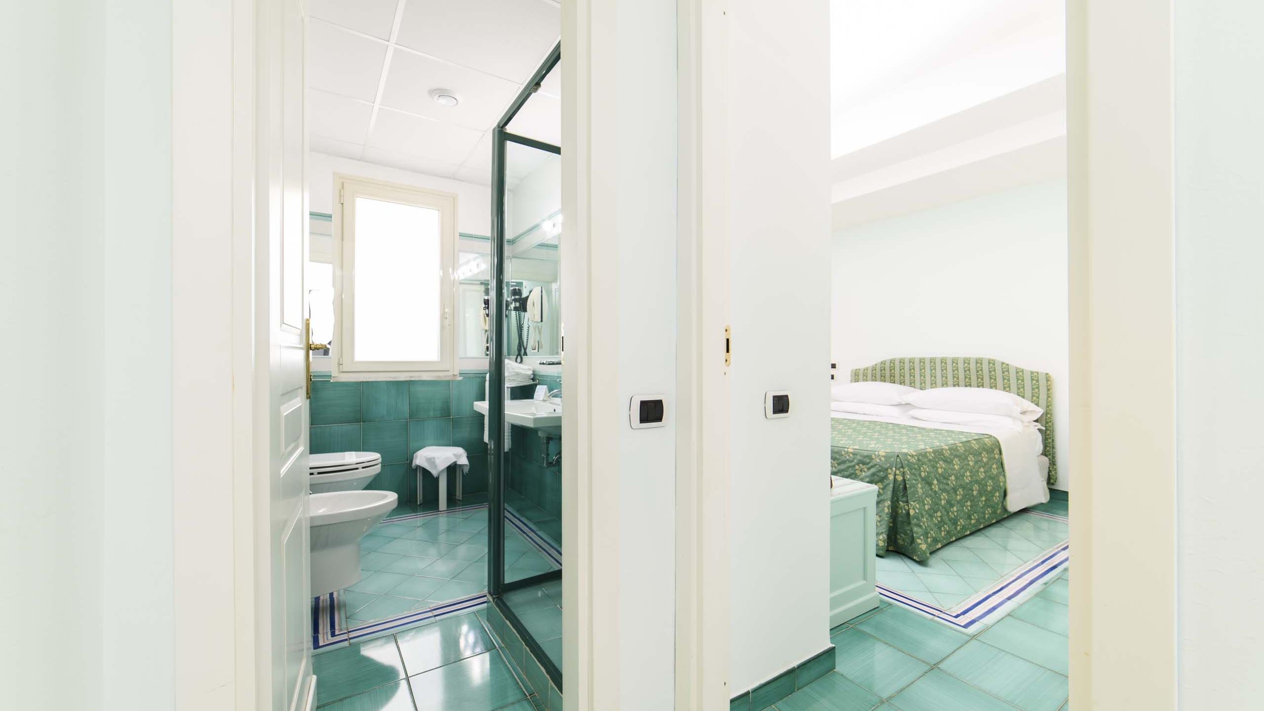 I freschi toni del blu e del verde delle maioliche vietresi decorano queste camere con finestra rendendole, insieme agli arredi in stile contemporaneo graziose ed accoglienti.
